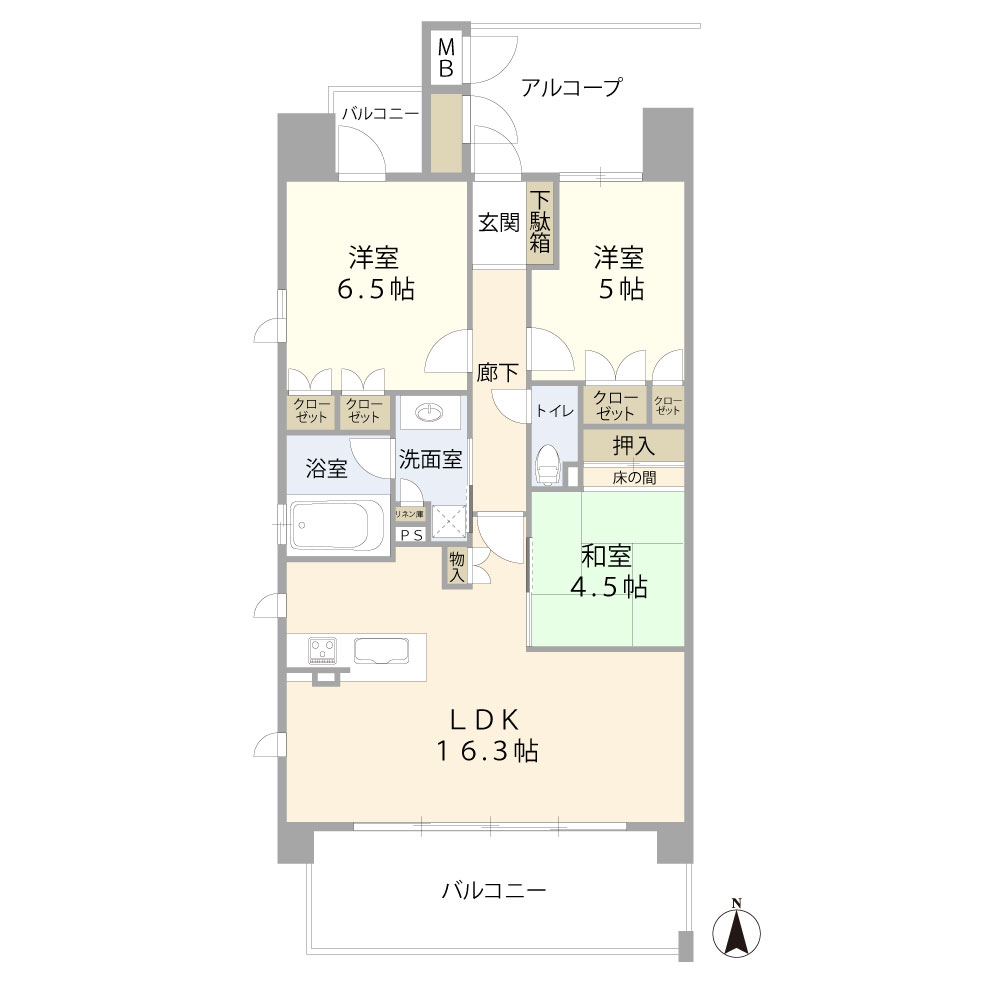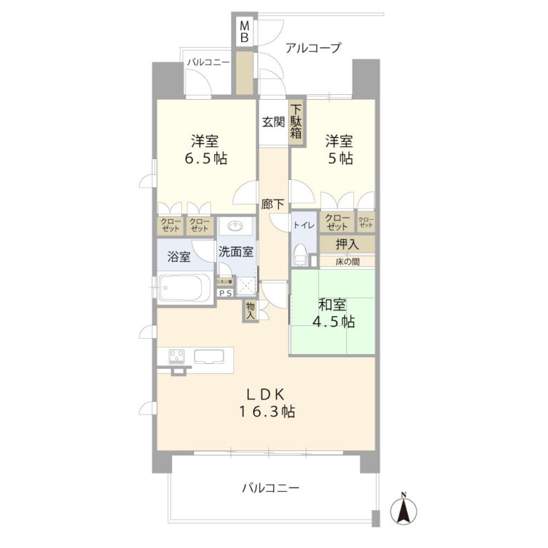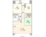 間取りは、長方形でオーソドックスな3LDKです。リビングに**隣接した和室(4.5帖)**は、実質的にリビングの一部として一体利用できるため、広々とした空間として活用できます。ただし、独立した居室として利用するには少々手狭に感じるかもしれません。
