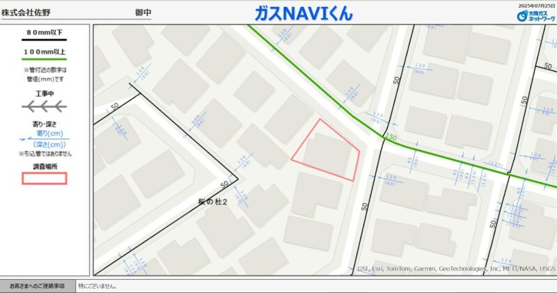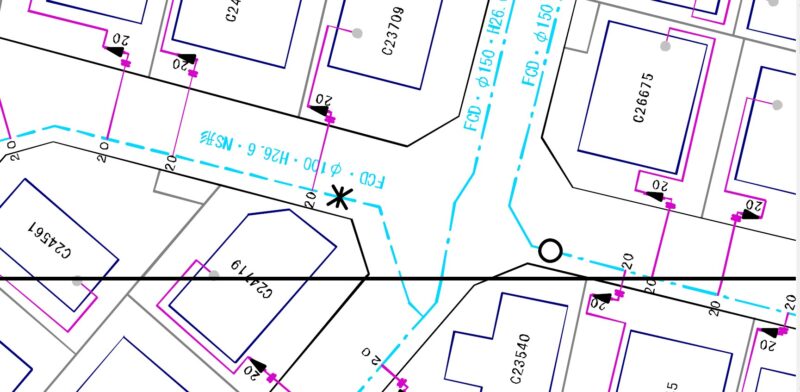 下記は、上下水道・ガスの図面です。実際に掘削を行って調査は出来ません。